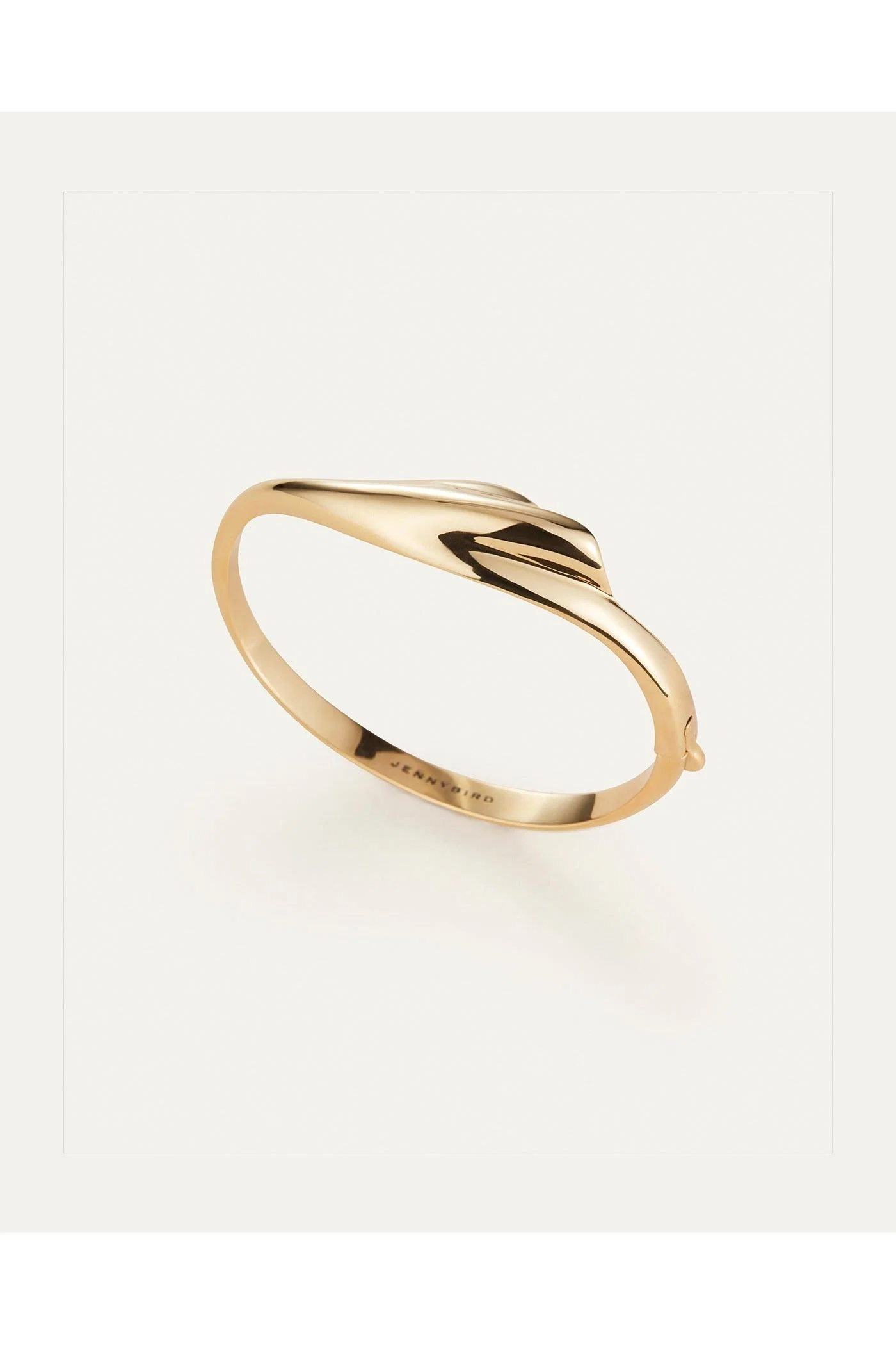 A light and lean bangle featuring a natural scalloped shell. It is water-durable, making it the perfect gold bracelet to mix into your wrist stack. This custom bangle opens and closes with a hinge and tab lock closure. To open, push down on the highest point of the clasp before pulling the bangle open. To close, listen for a "click" to ensure tab is locked properly. Finished in high-polish gold.