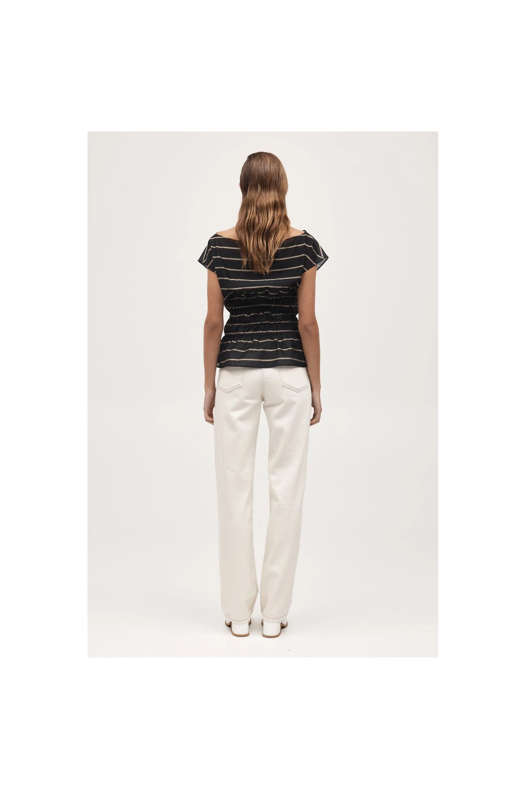 The Aida Top features a wide neckline and capped shoulder. This top features diagonal, elasticated detailing through the middle that softly cinches in the waist, creating an elegant silhouette. Can be worn on or off the shoulder offering multiple styling options. This version is crafted in a lightweight cotton / silk cloth with a black base and dark beige stripe. This fabric has a subtle sheerness.