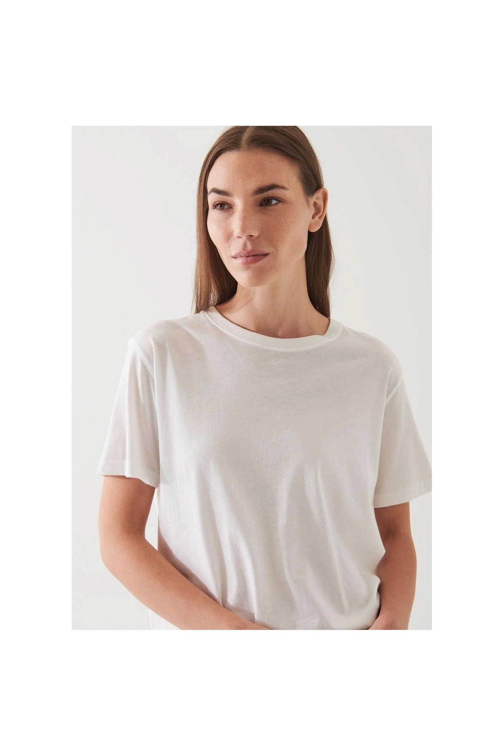 Our âBoyfriendâ short sleeve T-shirt is made from a lightweight pima cotton stretch jersey. It has a luxuriously soft hand feel and is cut for and oversized, comfortable fit. Style it partially tucked with your favourite jeans.